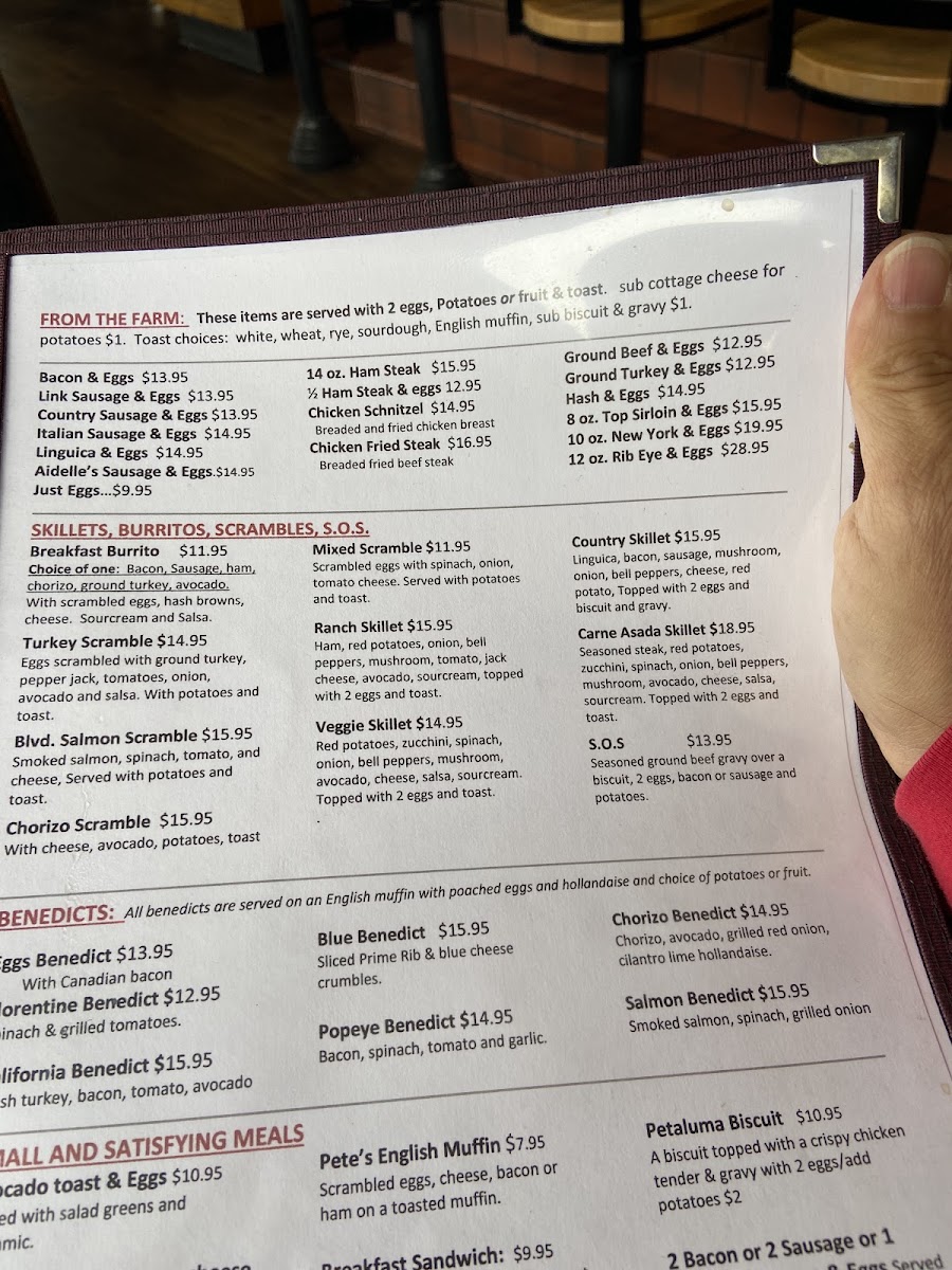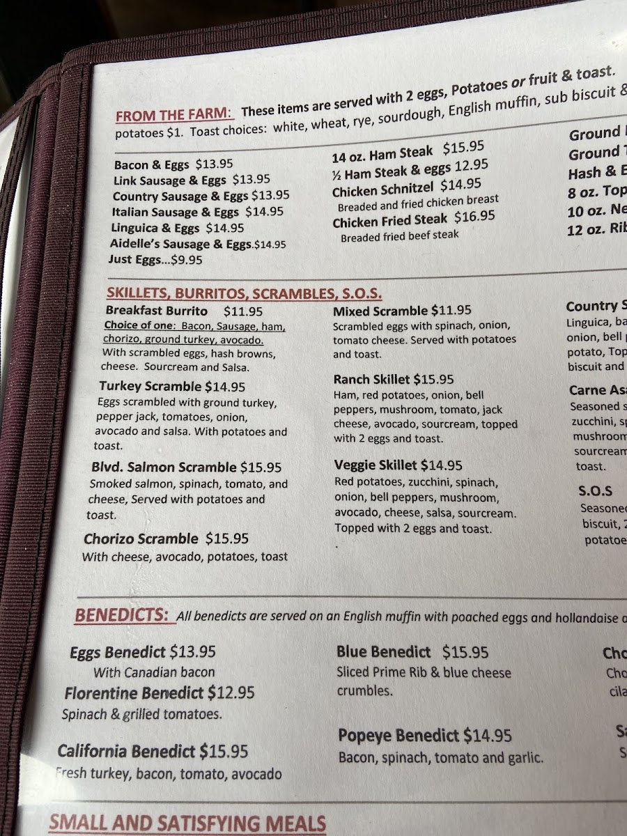 Linguica, bacon, sausage, mushroom, onions, peppers, country red potatoes, and topped with two eggs any style. Served with biscuits and gravy or toast