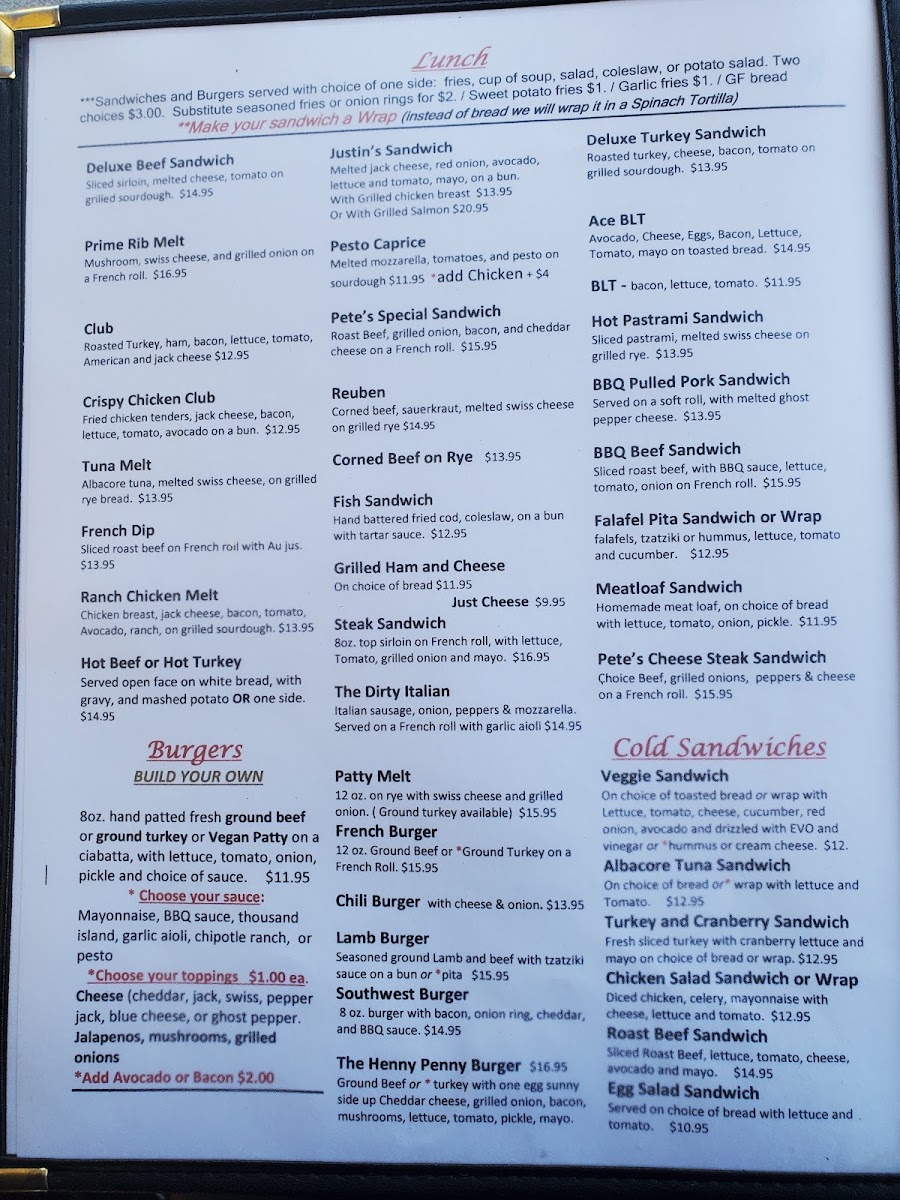 Choice of turkey, ham, tuna, roast beef, or deviled eggs with lettuce and onions on a choice of toast with either french fries, soup, or coleslaw